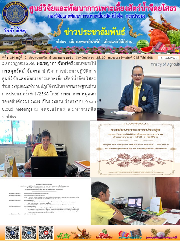 นายศุภรัตน์ ขันงาม นักวิชาการประมงปฏิบัติการ ศูนย์วิจัยและพัฒนาการเพาะเลี้ยงสัตว์น้ำจืดยโสธร ร่วมประชุมคณะทำงานปฏิบัติงานในเขตพระราชฐานด้านการประมง ครั้งที่ 1/2568