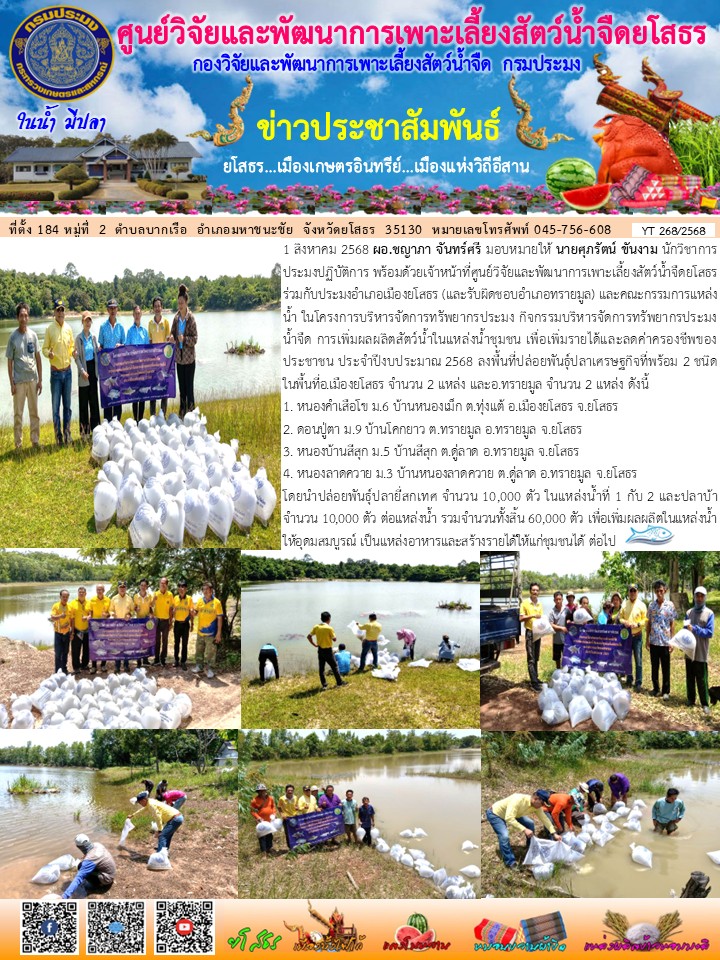 เจ้าหน้าที่ศพจ.ยโสธร ร่วมกับปอ.เมืองยโสธร (และรับผิดชอบอำเภอทรายมูล) และคณะกรรมการแหล่งน้ำ ในกิจกรรมบริหารจัดการทรัพยากรประมงน้ำจืด การเพิ่มผลผลิตสัตว์น้ำในแหล่งน้ำชุมชนฯ ลงพื้นที่ปล่อยพันธุ์ปลาในพื้นที่อ.เมืองยโสธร และอ.ทรายมูล