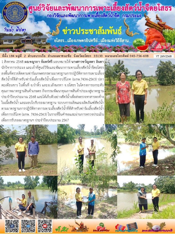เจ้าที่ศพจ.ยโสธร ลงพื้นที่ตรวจติดตามฟาร์มเกษตรกรตามมาตรฐานการปฏิบัติทางการเพาะเลี้ยงสัตว์น้ำที่ดีสำหรับฟาร์มเลี้ยงสัตว์น้ำเพื่อการบริโภค (มกษ.7436-2563) ปลาตะเพียนขาว และมอบใบรับรองมาตรฐานฯ ในรายที่ยื่นคำขอและผ่านมาตรฐานฯ