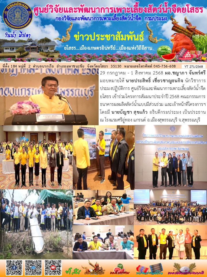 นายประสิทธิ์ เชี่ยวชาญธนกิจ นักวิชาการประมงปฏิบัติการ ศูนย์วิจัยและพัฒนาการเพาะเลี้ยงสัตว์น้ำจืดยโสธร เข้าร่วมโครงการสัมมนาประจำปี 2568 คณะกรรมการธนาคารผลผลิตสัตว์น้ำแบบมีส่วนร่วม และเจ้าหน้าที่โครงการฯ