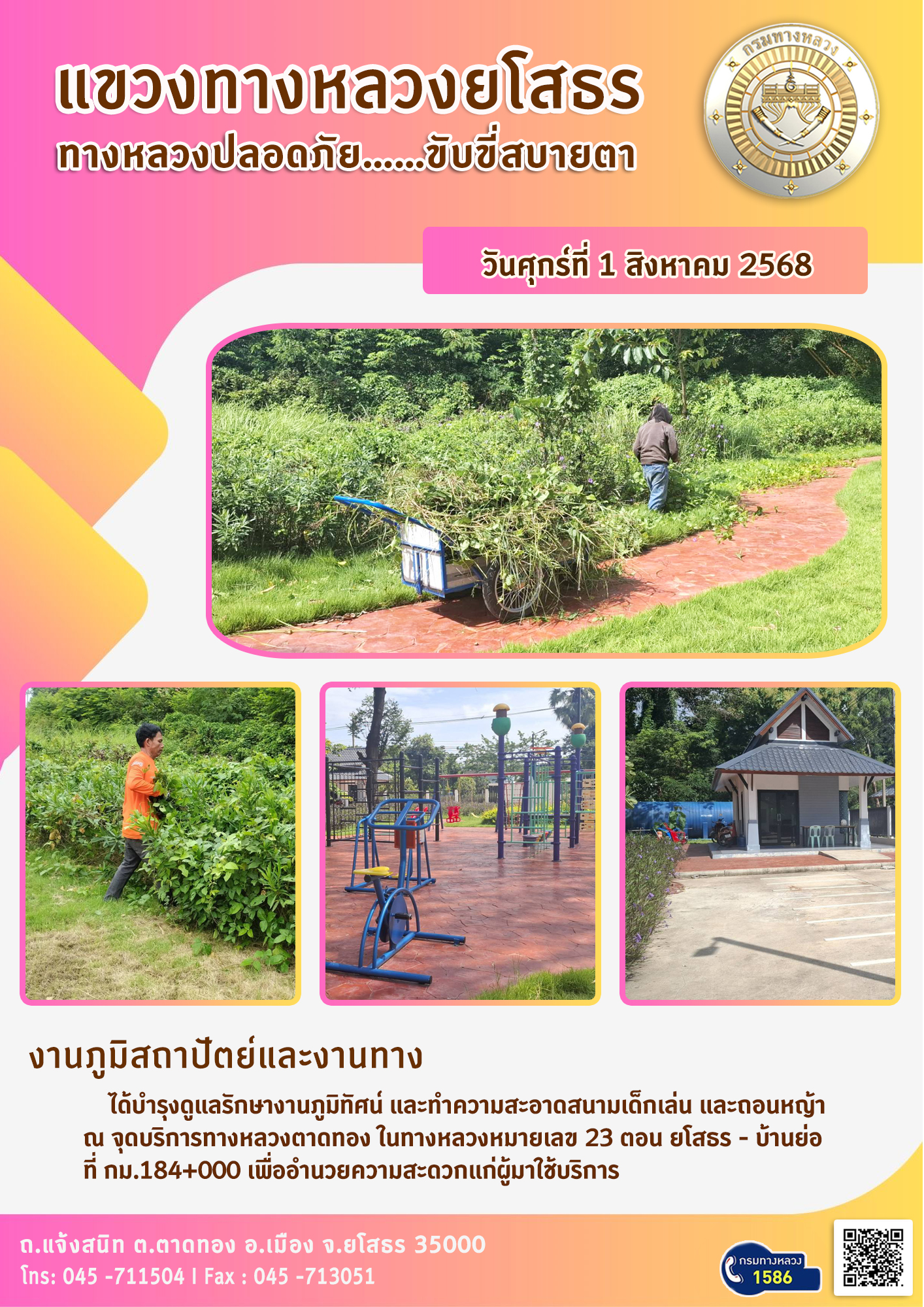 วันศุกร์ที่ 1 สิงหาคม 2568 งานภูมิสถาปัตย์และงานทาง ได้บำรุงดูแลรักษางานภูมิทัศน์ และทำความสะอาดสนามเด็กเล่น และถอนหญ้า ณ จุดบริการทางหลวงตาดทอง ในทางหลวงหมายเลข 23 ตอน ยโสรร - บ้านย่อ ที่ กม.184+000 เพื่ออำนวยความสะดวกแก่ผู้มาใช้บริการ