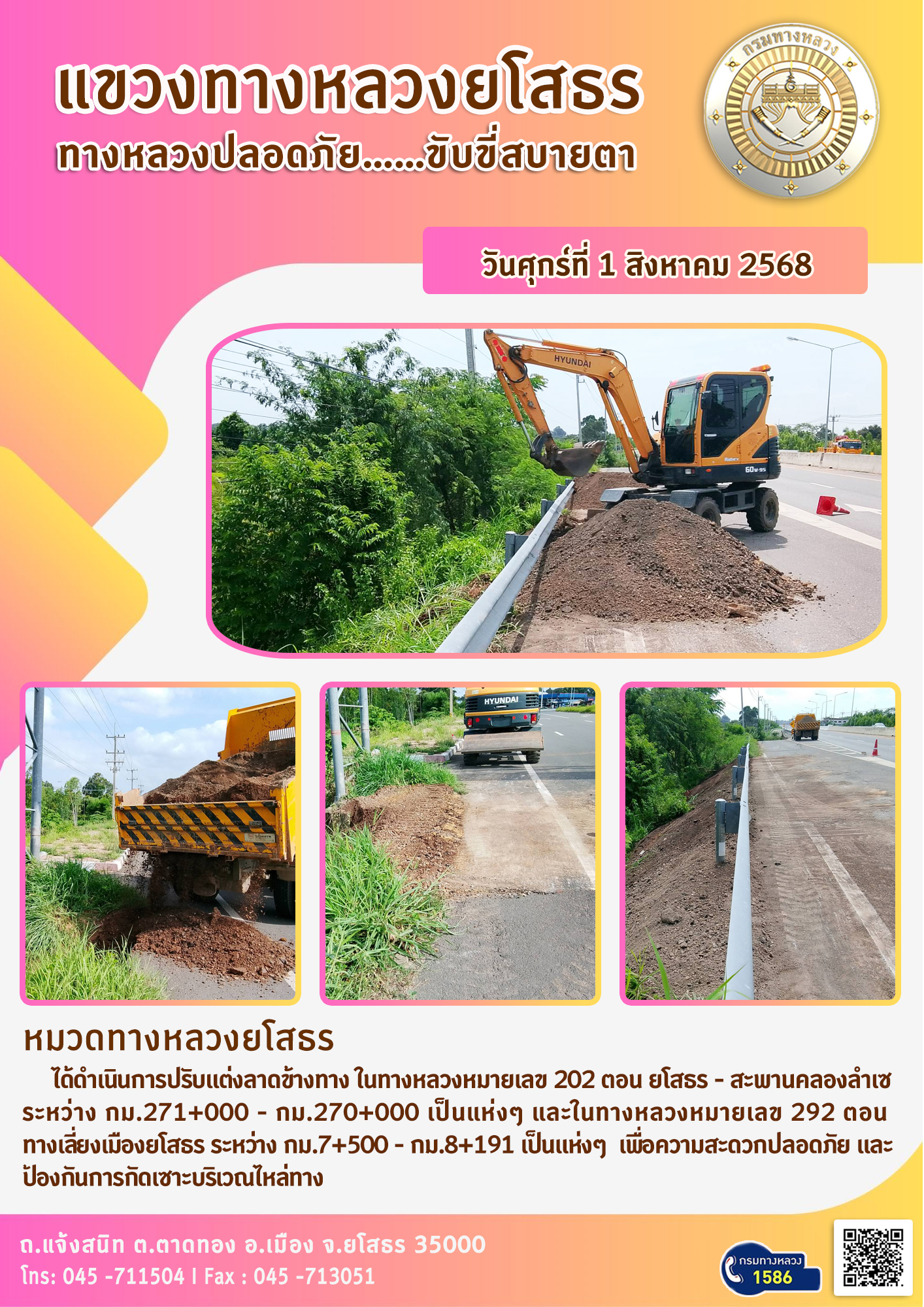วันศุกร์ที่ 1 สิงหาคม 2568 หมวดทางหลวงยโสธร ได้ดำเนินการปรับแต่งข้างทาง ในทางหลวงหมายเลข 202 ตอน ยโสรร - สะพานคลองล่าเซ ระหว่าง กม.271+000 - กม.270+000 เป็นแห่งๆ และในทางหลวงหมายเลข 292 ตอน ทางเลี่ยงเมืองยโสธร ระหว่าง กม.7+500 - กม.8+191 เป็นแห่งๆ