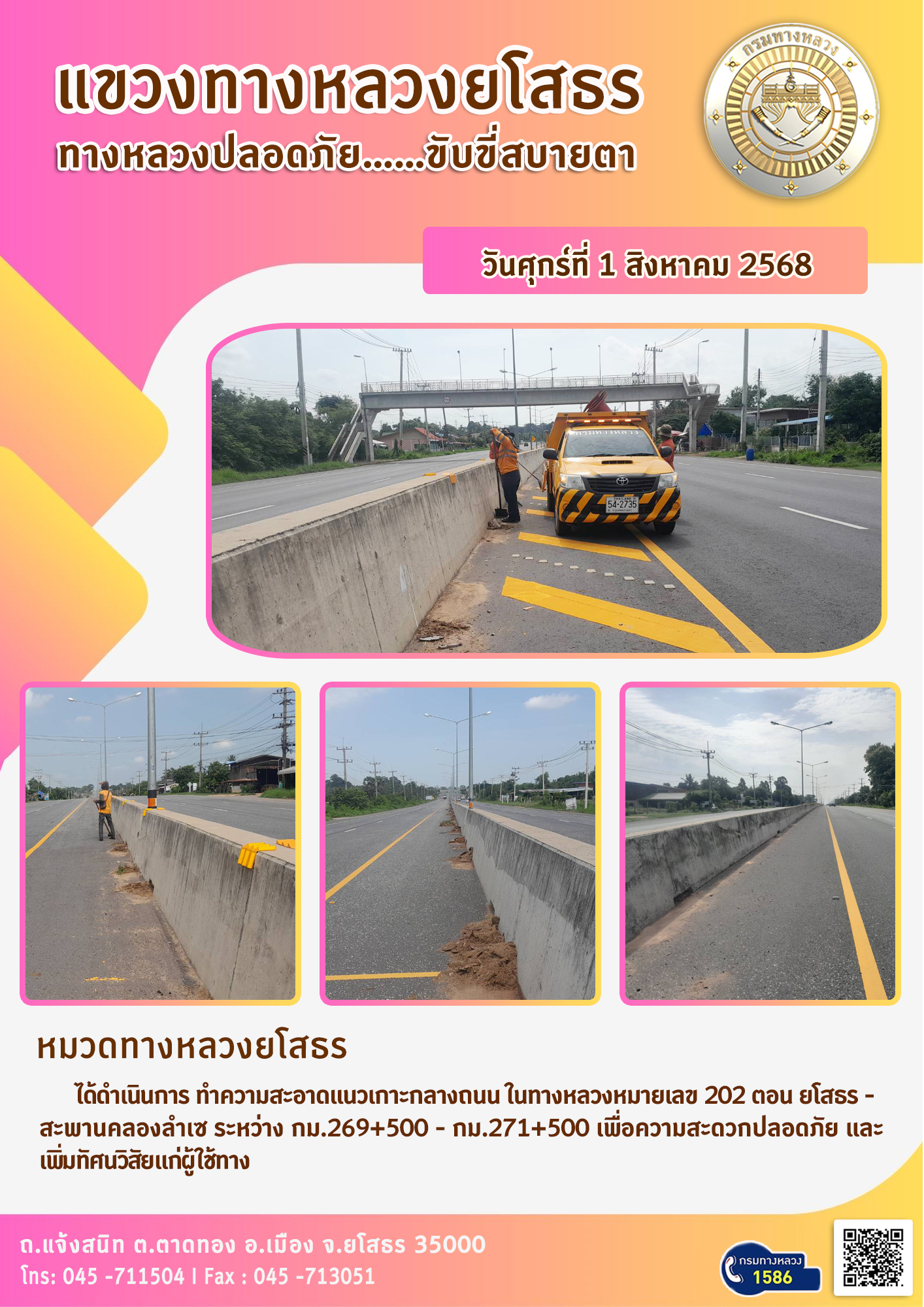 วันศุกร์ที่ 1 สิงหาคม 2568 หมวดทางหลวงยโสธร ได้ดำเนินการ ทำความสะอาดแนวเกาะกลางถนม ในทางหลวงหมายเลข 202 ตอน ยโสรร - สะพานคลองลำเซ ระหว่าง กม.269+500 - กม.271+500 เพื่อความสะดวกปลอดภัย และเพิ่มทัศนวิสัยแก่ผู้ใช้ทาง