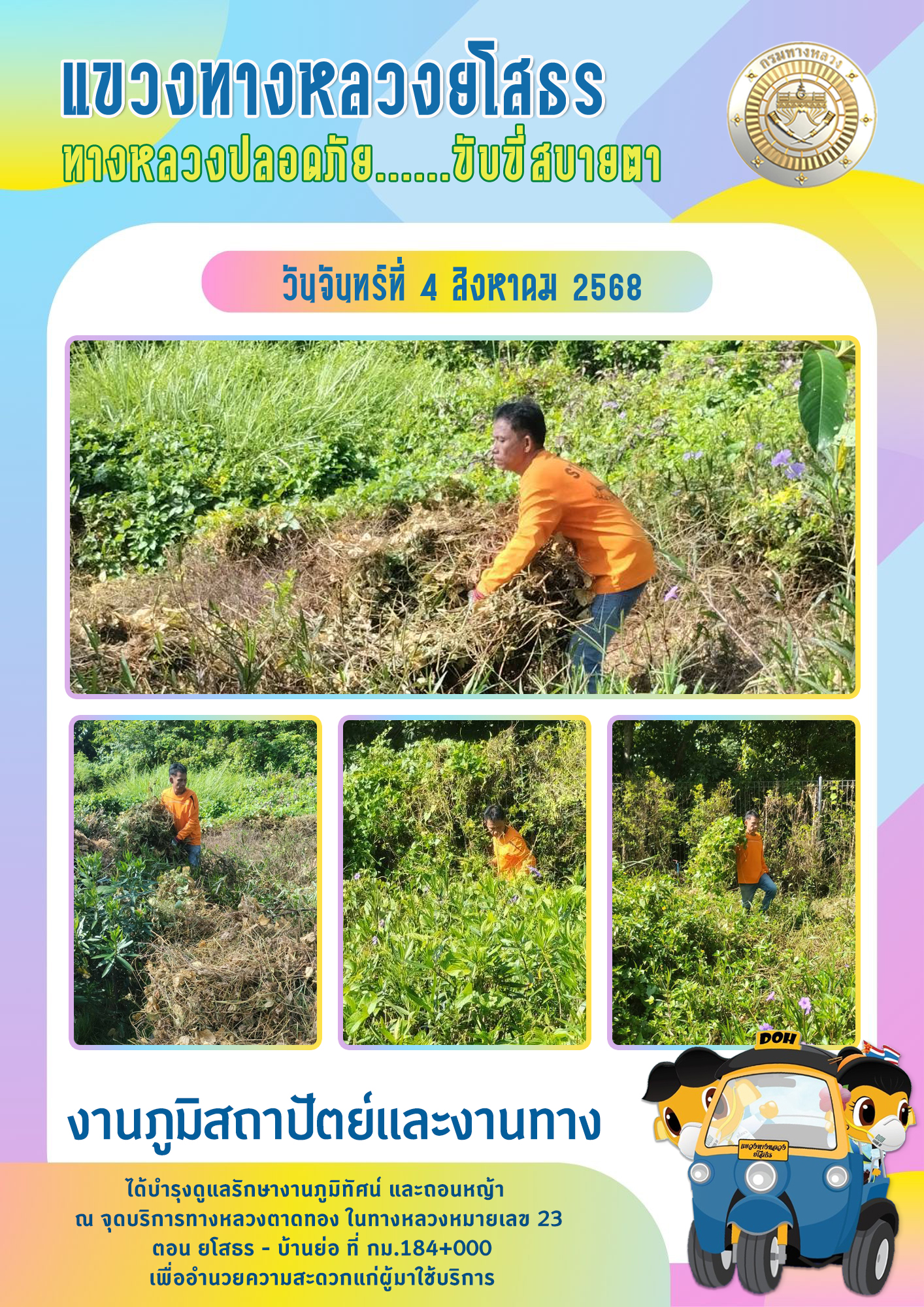 วันจันทร์ที่ 4 สิงหาคม 2568 งานภูมิสถาปัตย์และงานทาง ได้บำรุงดูแลรักษางานภูมิทัศน์ และถอนหญ้า ณ จุดบริการทางหลวงตาดทอง ในทางหลวงหมายเลข 23 ตอน ยโสธร - บ้านย่อ ที่ กม.184+000 เพื่ออำนวยความสะดวกแก่ผู้มาใช้บริการ