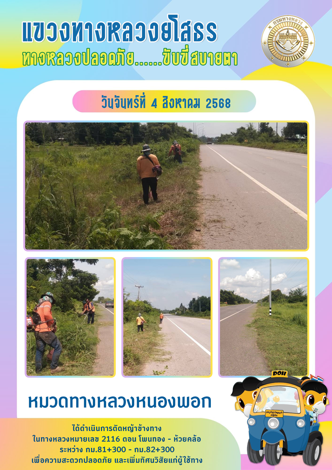 วันจันทร์ที่ 4 สิงหาคม 2568 หมวดทางหลวงหนองพอก ได้ดำเนินการตัดหญ้าข้างทาง ในทางหลวงหมายเลข 2116 ตอน โพนทอง - ห้วยคล้อ ระหว่าง กม.81+300 - กม.82+300 เพื่อความสะดวกปลอดภัย และเพิ่มทัศนวิสัยแก่ผู้ใช้ทาง