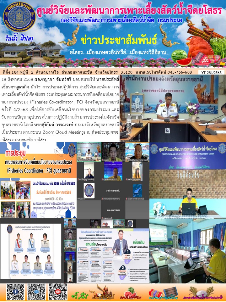 นายประสิทธิ์ เชี่ยวชาญธนกิจ นักวิชาการประมงปฏิบัติการ ศูนย์วิจัยและพัฒนาการเพาะเลี้ยงสัตว์น้ำจืดยโสธร ร่วมประชุมคณะกรรมการขับเคลื่อนนโยบายของกรมประมง (Fisheries Co-ordinator : FC) จังหวัดอุบลราชธานี ครั้งที่ 4/2568