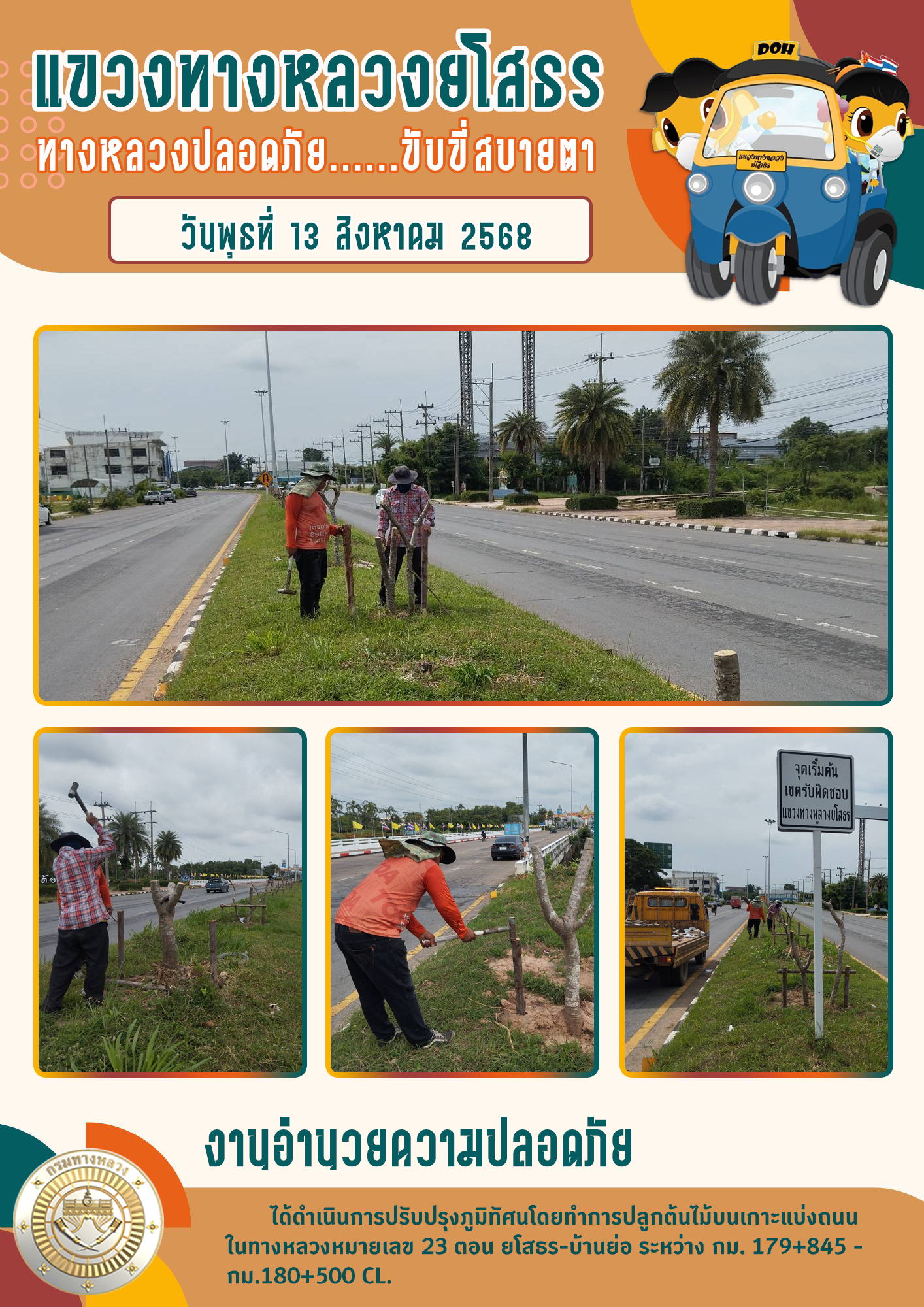 นพุธที่ 13 สิงหาคม 2568 งานอํานวยความปลอดภัย ได้ดำเนินการปรับปรุงภูมิทัศนโดยทำการปลูกต้นไม้บนเกาะแบ่งถนน ในทางหลวงหมายเลข 23 ตอน ยโสธร-บ้านย่อ ระหว่าง กม. 179+845 - กม.180+500