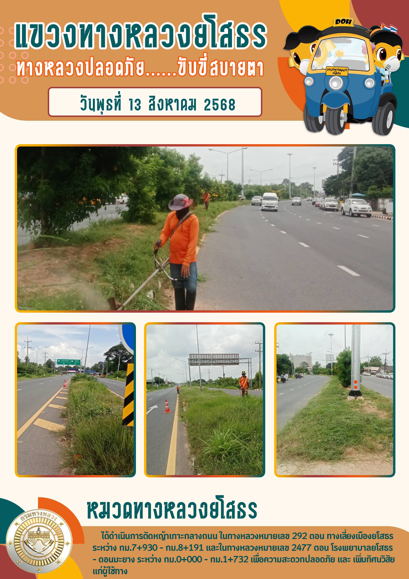 วันพุธที่ 13 สิงหาคม 2568 หมวดทางหลวงยโสธร ได้ดำเนินการตัดหญ้าเกาะกลางถนน ในทางหลวงหมายเลข 292 ตอน ทางเลี่ยงเมืองยโสรร ระหว่าง กม.7+930 - กม.8+191 และในทางหลวงหมายเลข 2477 ตอน โรงพยาบาลยโสธร - ดอนมะยาง ระหว่าง กม.0+000 - กม.1+732 เพื่อความสะดวกปลอดภั