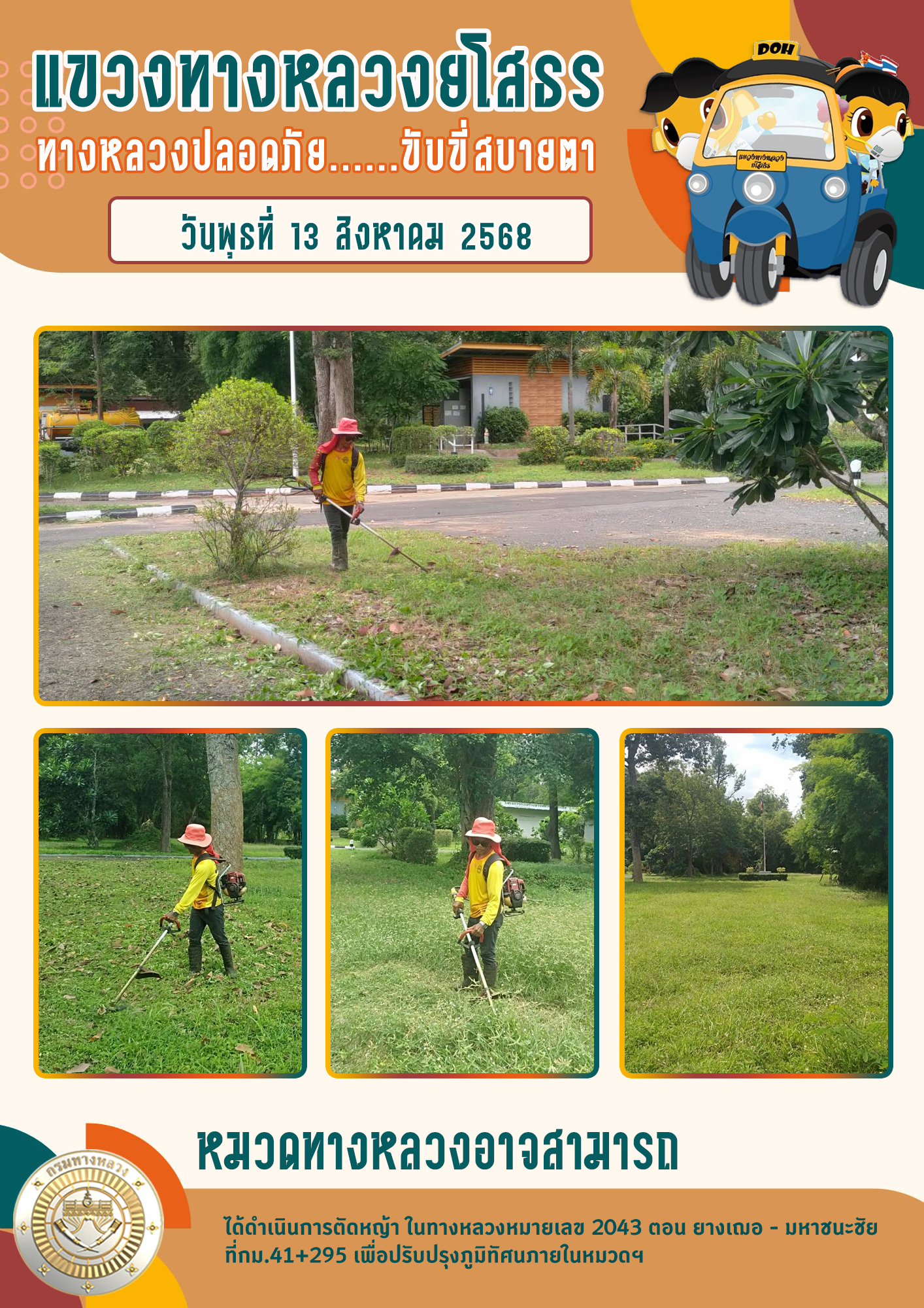 วันพุธที่ 13 สิงหาคม 2568 หมวดทางหลวงอาจสามารถ ได้ดำเนินการตัดหญ้า ในทางหลวงหมายเลข 2043 ตอน ยางเฌอ - มหาชนะชัย ที่ กม.41+295 เพื่อปรับปรุงภูมิทัศน์ ภายในหมวดฯ