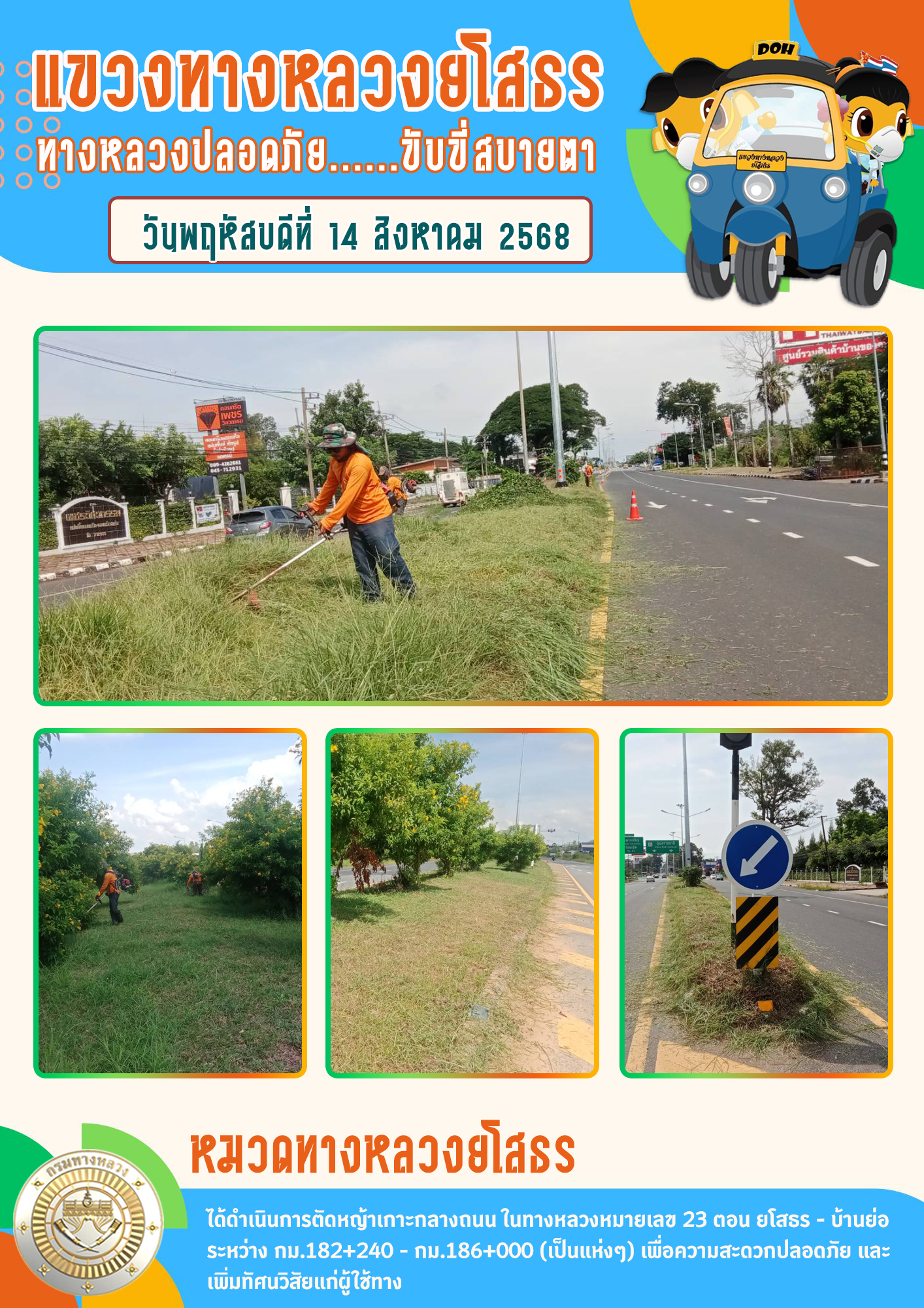 วันพฤหัสบดีที่ 14 สิงหาคม 2568 หมวดทางหลวงยโสธร ได้ดำเนินการตัดหญ้าเกาะกลางถนน ในทางหลวงหมายเลข 23 ตอน ยโสธร - บ้านย่อ ระหว่าง กม.182+240 - กม.186+000 (เป็นแห่งๆ) เพื่อความสะดวกปลอดภัย และเพิ่มทัศนวิสัยแก่ผู้ใช้ทาง