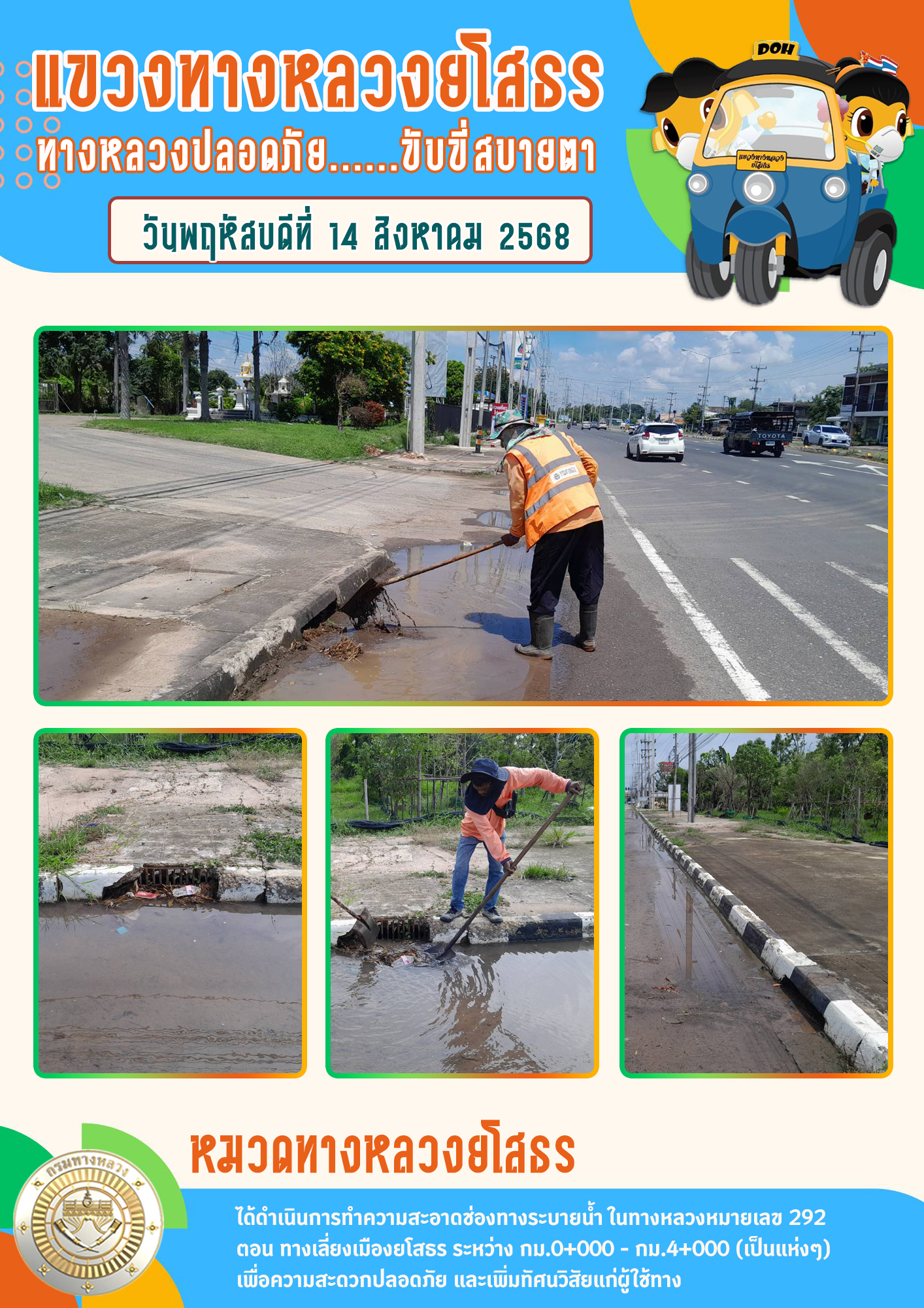 วันพฤหัสบดีที่ 14 สิงหาคม 2568 หมวดทางหลวงยโสธร ได้ดำเนินการทำความสะอาดช่องทางระบายน้ำ ในทางหลวงหมายเลข 292 ตอน ทางเลี่ยงเมืองยโสธร ระหว่าง กม.0+000 - กม.4+000 (เป็นแห่งๆ) เพื่อความสะดวกปลอดภัย และเพิ่มทัศนวิสัยแก่ผู้ใช้ทาง