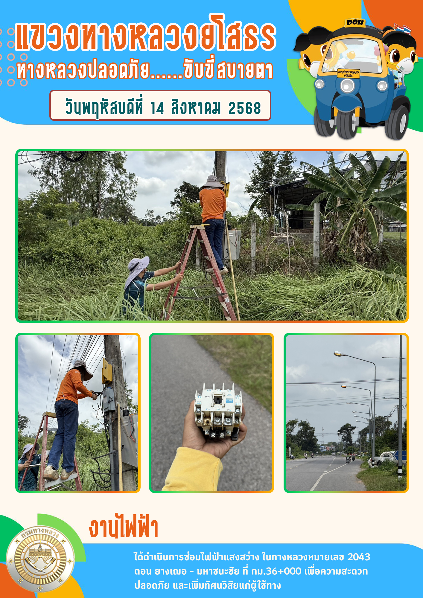 วันพฤหัสบดีที่ 14 สิงหาคม 2568 งานไฟฟ้า ได้ดำเนินการซ่อมไฟฟ้าแสงสว่าง ในทางหลวงหมายเลข 2043 ตอน ยางเฌอ - มหาชนะชัย ที่ กม.36+000 เพื่อความสะดวก ปลอดภัย และเพิ่มทัศนวิสัยแก่ผู้ใช้ทาง