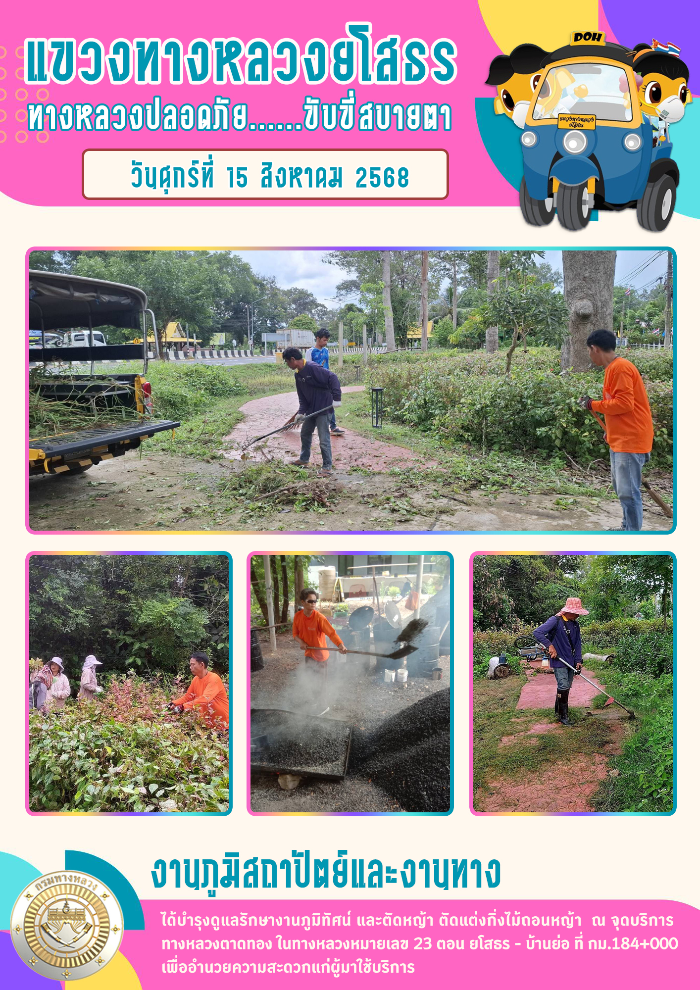 วันศุกร์ที่ 15 สิงหาคม 2568 งานภูมิสถาปัตย์และงานทาง ได้บำรุงดูแลรักษางานภูมิทัศน์ และตัดหญ้า ตัดแต่งกิ่งไม้ถอนหญ้า ณ จุดบริการ ทางหลวงตาดทอง ในทางหลวงหมายเลข 23 ตอน ยโสธร - บ้านย่อ ที่ กม.184+000 เพื่ออำนวยความสะดวกแก่ผู้มาใช้บริการ