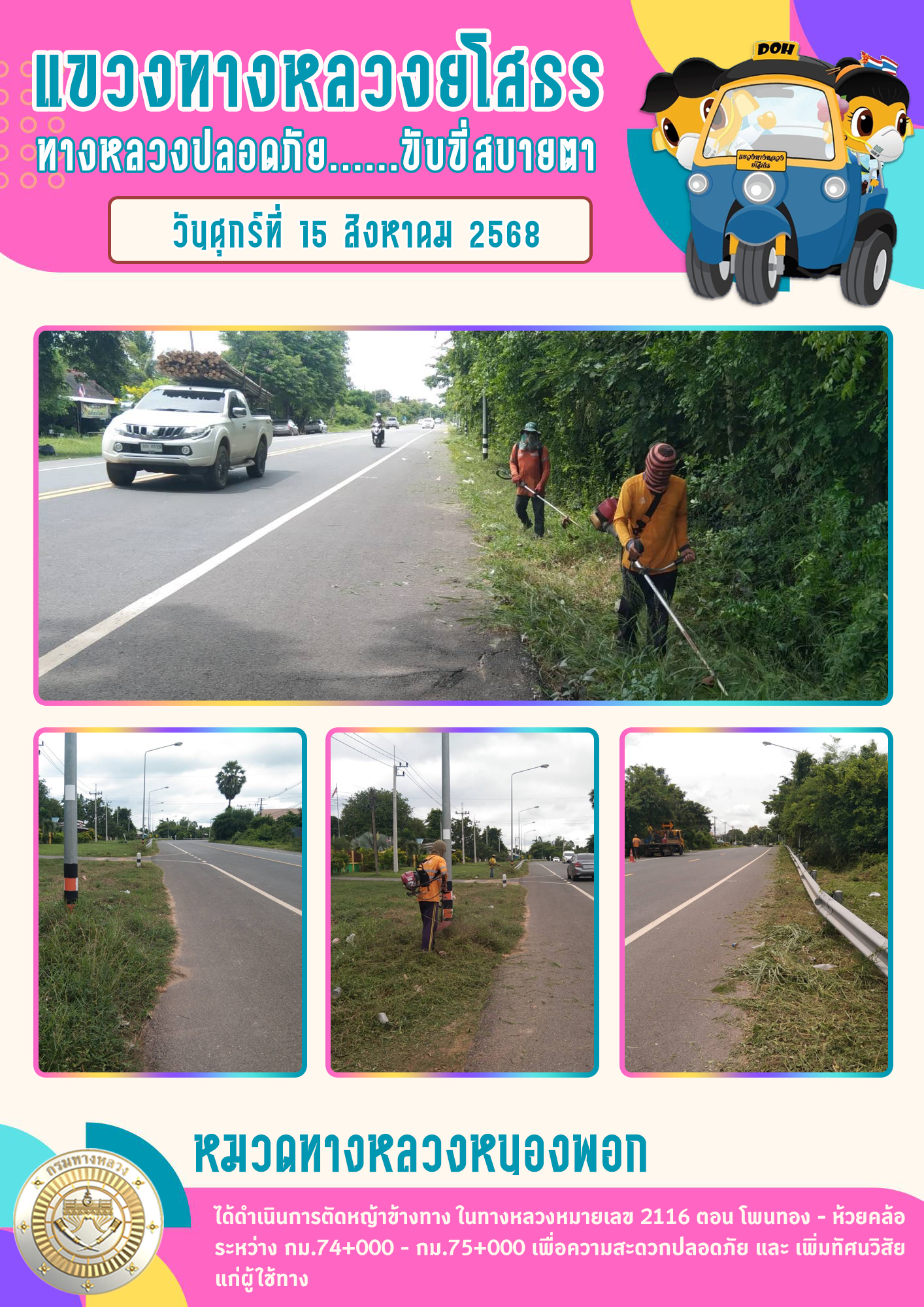 วันศุกร์ที่ 15 สิงหาคม 2568 หมวดทางหลวงหนองพอก ได้ดำเนินการตัดหญ้าข้างทาง ในทางหลวงหมายเลข 2116 ตอน โพนทอง - ห้วยคล้อ ระหว่าง กม.74+000 - กม.75+000 เพื่อความสะดวกปลอดภัย และเพิ่มทัศนวิสัย แก่ผู้ใช้ทาง