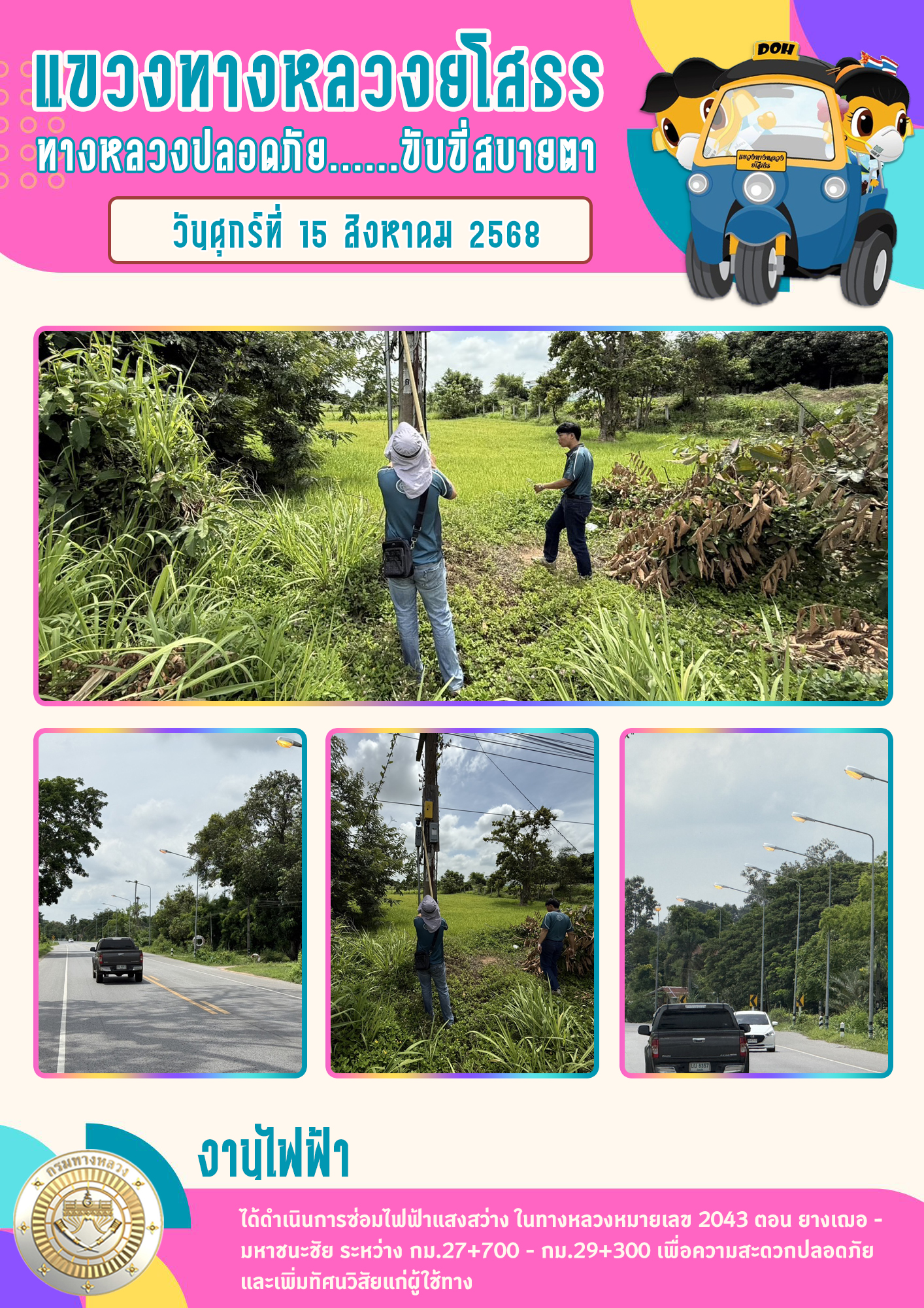 วันศุกร์ที่ 15 สิงหาคม 2568 งานไฟฟ้า ได้ดำเนินการซ่อมไฟฟ้าแสงสว่าง ในทางหลวงหมายเลข 2043 ตอน ยางเฌอ - มหาชนะชัย ระหว่าง กม.27+700 - กม.29+300 เพื่อความสะดวกปลอดภัย และเพิ่มทัศนวิสัยแก่ผู้ใช้ทาง