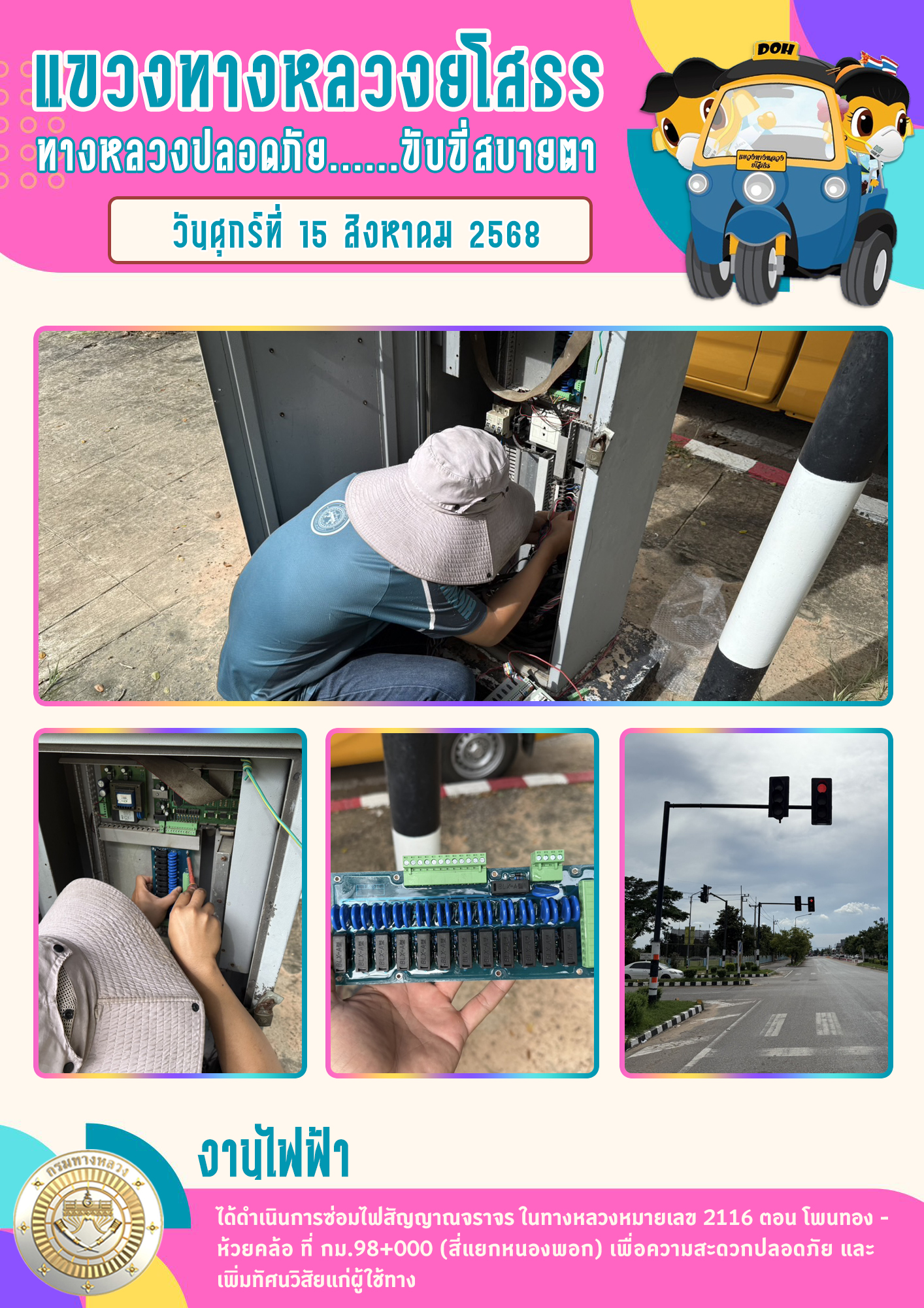 วันศุกร์ที่ 15 สิงหาคม 2568 งานไฟฟ้า ได้ดำเนินการซ่อมไฟสัญญาณจราจร ในทางหลวงหมายเลข 2116 ตอน โพนทอง - ห้วยคล้อ ที่ กม.98+000 (สี่แยกหนองพอก) เพื่อความสะดวกปลอดภัย และเพิ่มทัศนวิสัยแก่ผู้ใช้ทาง