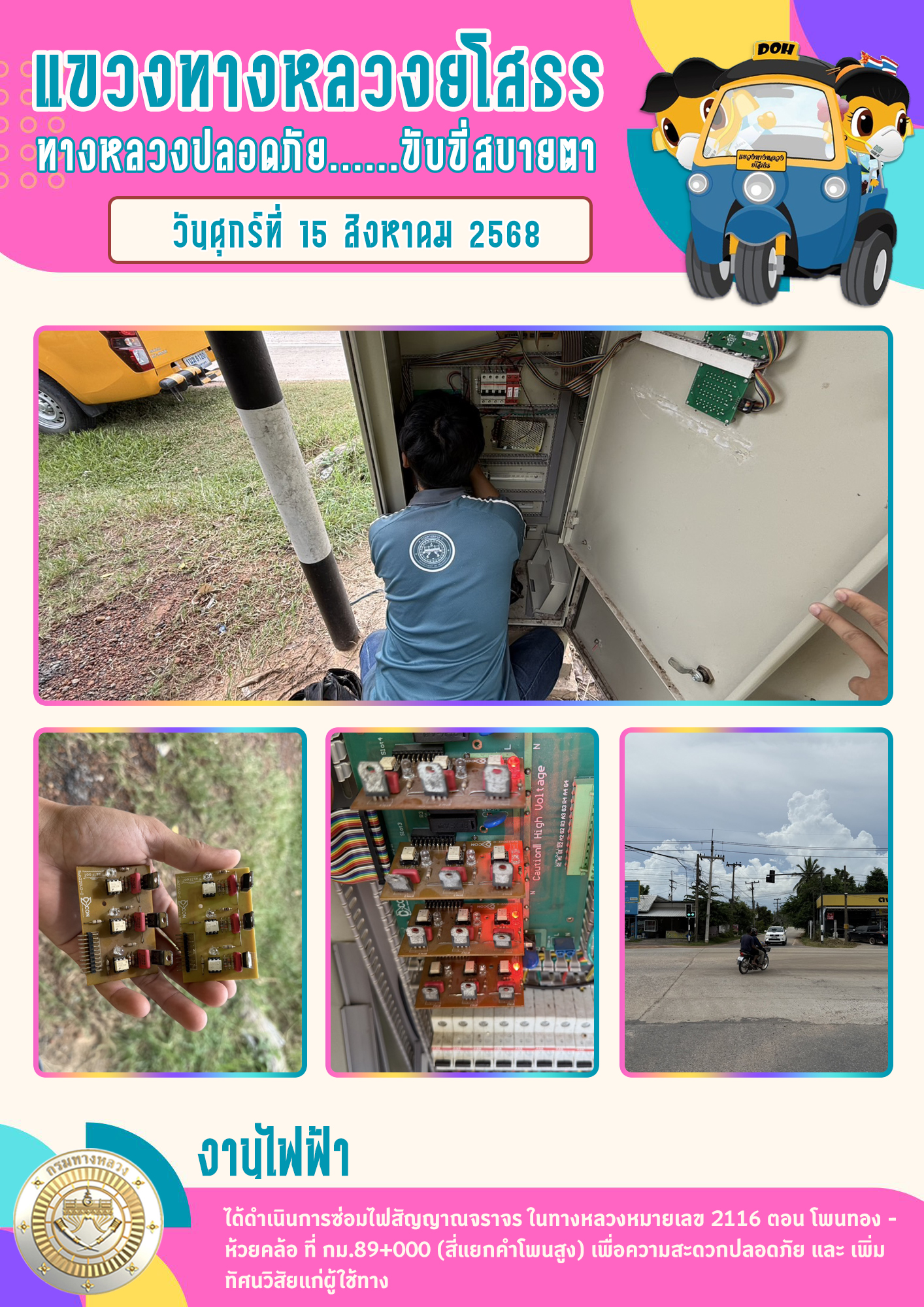 วันศุกร์ที่ 15 สิงหาคม 2568 งานไฟฟ้า ได้ดำเนินการซ่อมไฟสัญญาณจราจร ในทางหลวงหมายเลข 2116 ตอน โพนทอง - ห้วยคล้อ ที่ กม.89+000 (สี่แยกคำโพนสูง) เพื่อความสะดวกปลอดภัย และเพิ่มทัศนวิสัยแก่ผู้ใช้ทาง